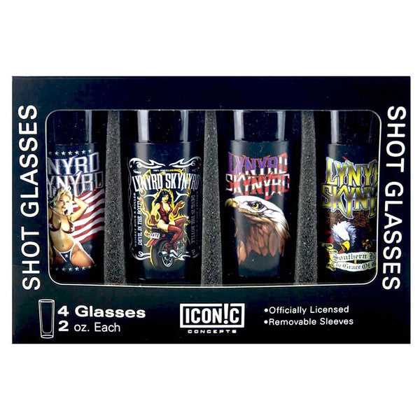 Lynyrd Skynyrd Shot Glass 4 Pc Set In Tin Lynyrd Skynyrd Shot Glass 4 Pc Set. *4 x 2 oz Shot Glasses *Changeable Aluminum Sleeves *Window Tin Storage Box...() ( No reviews)